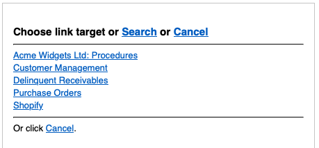 Click on the desired target link to select that, Search to open the Search Window (see below), or Cancel (in which case the link will not be set).